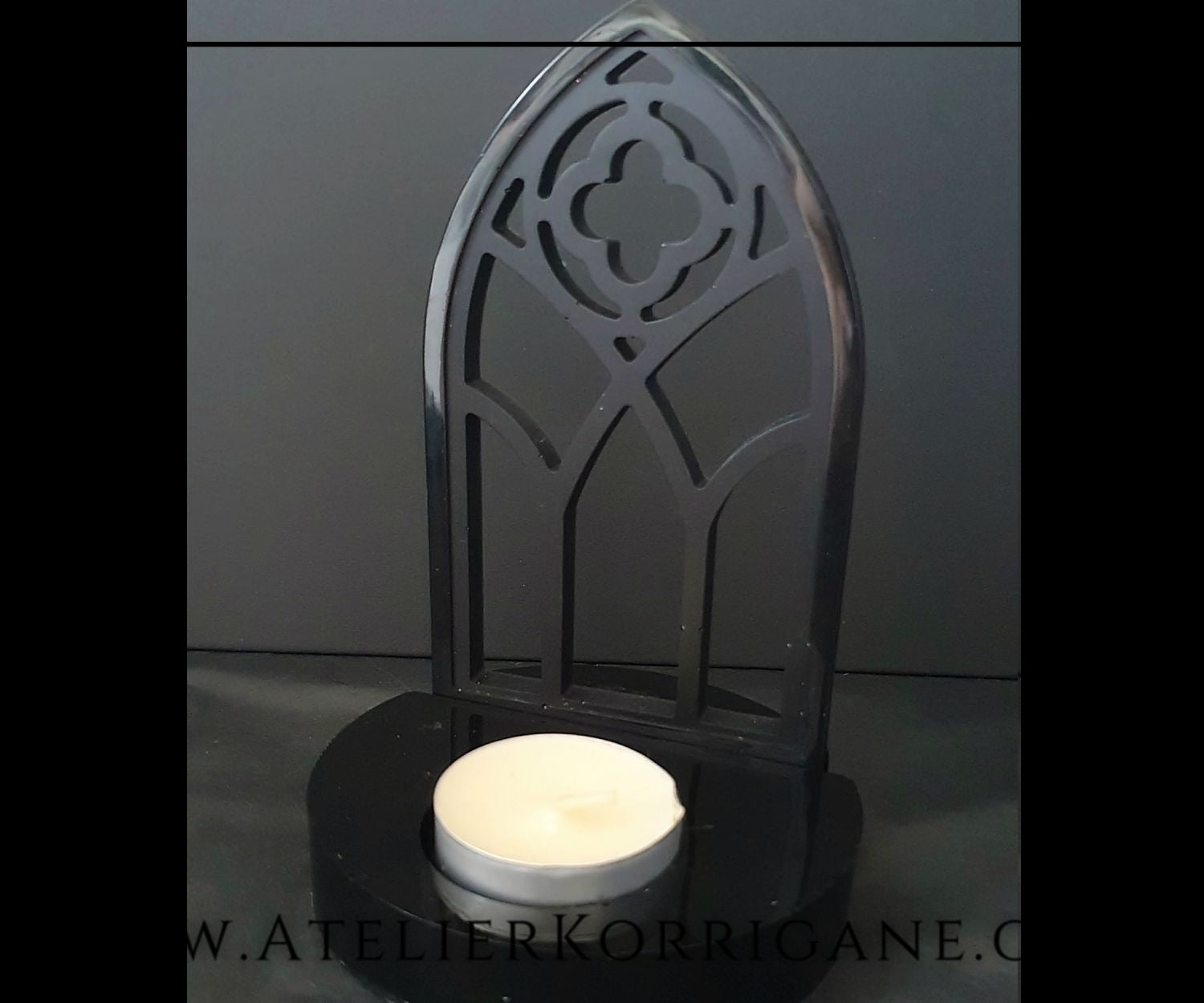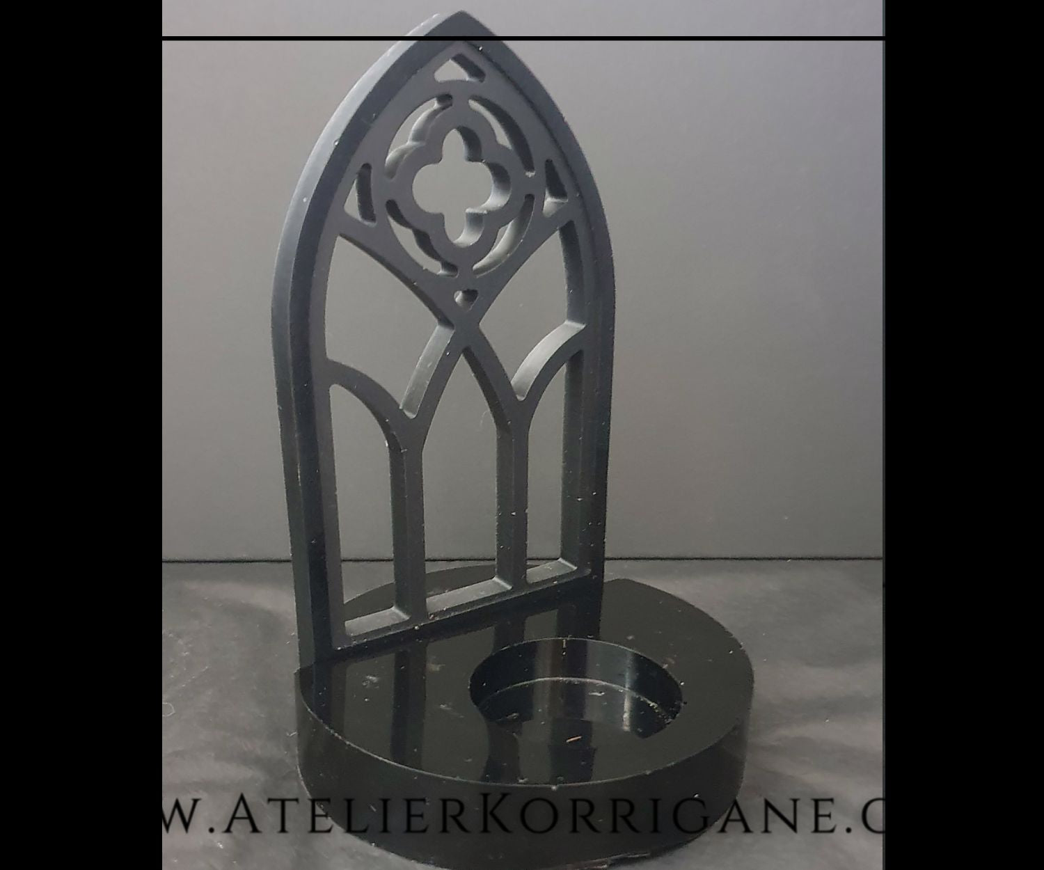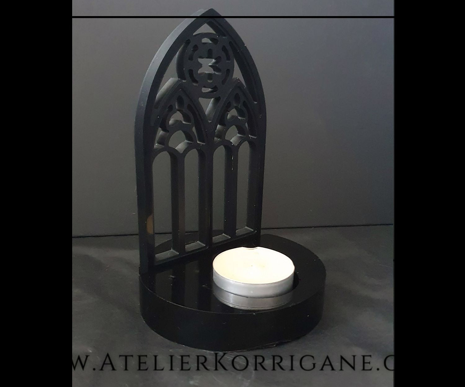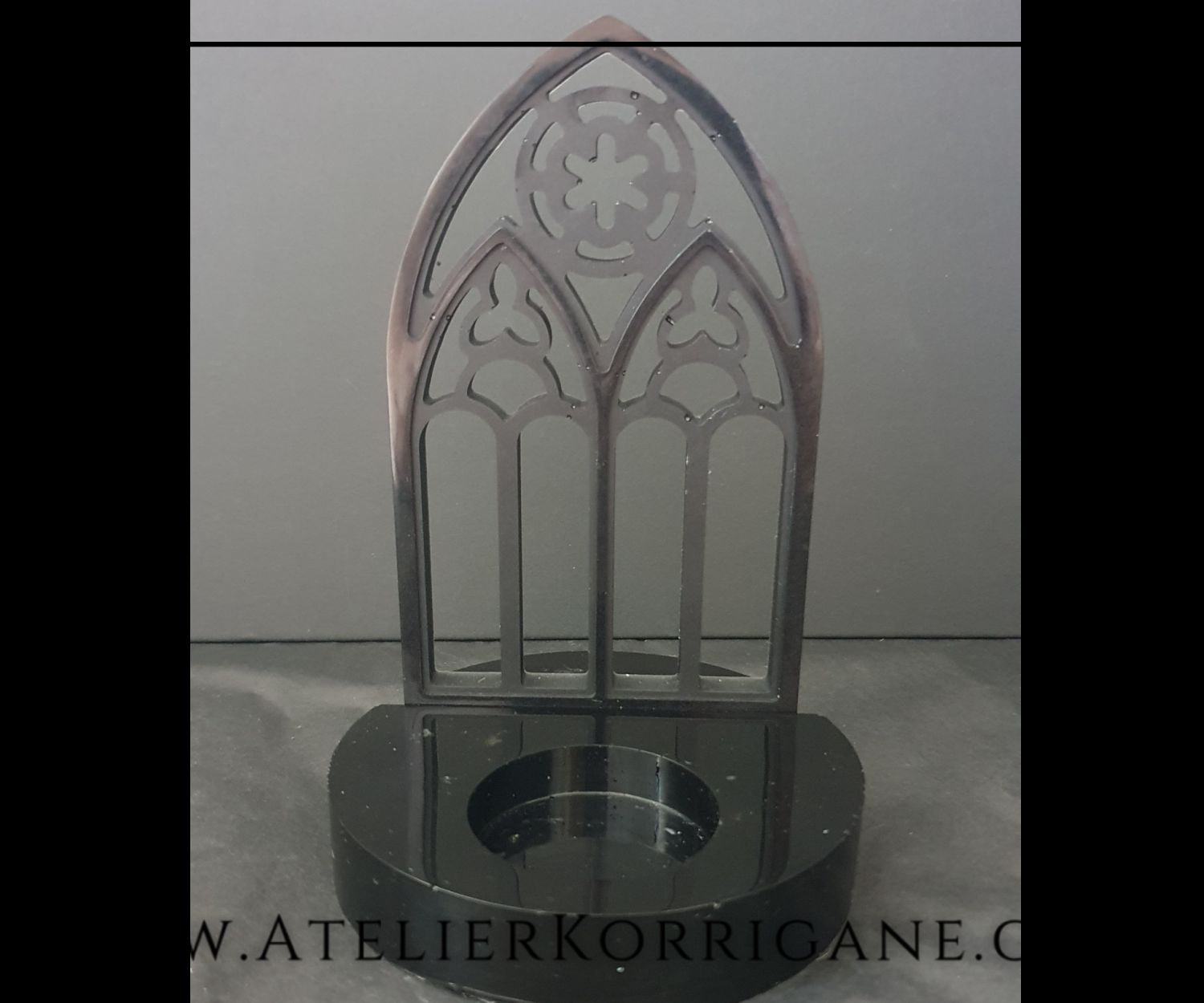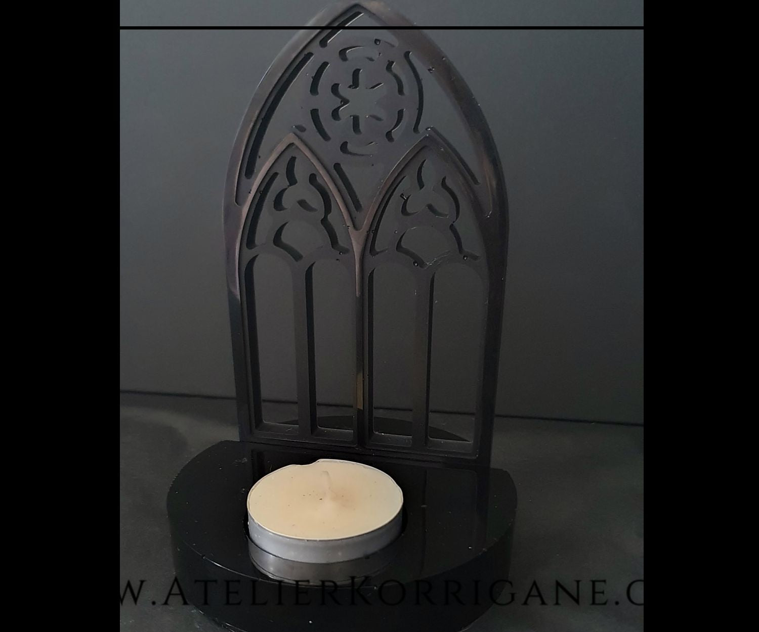 Ce bougeoir pour bougies chauffe-plat, comporte 2 vitraux interchangeables, de cathédrale.