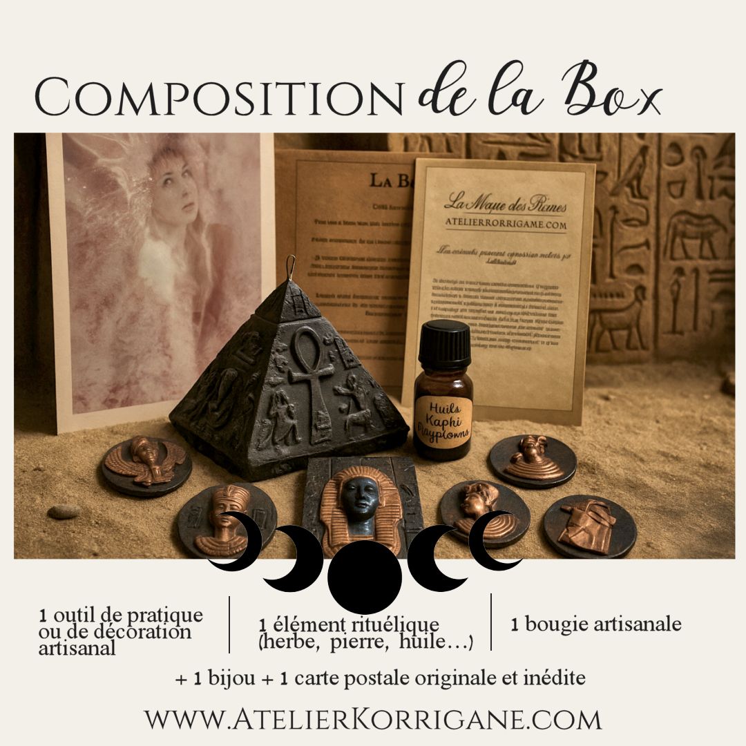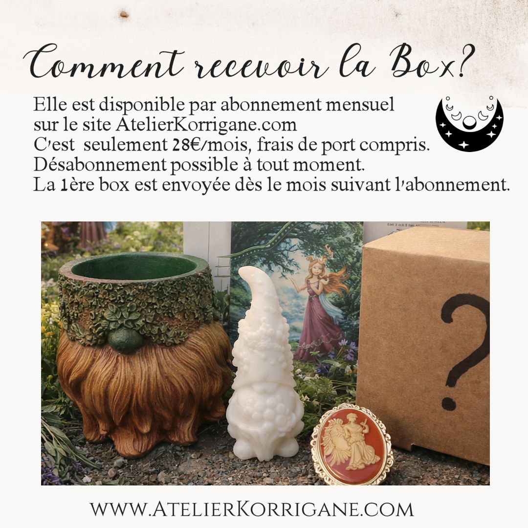 Comme vous pouvez le constater la majeure partie des éléments présents dans ces box sont crées à l’Atelier Korrigane, il s'agit d'un travail artisanal, et non pas de production de masse comme on peut en trouver souvent dans certains types de box. J'espère que vous saurez en apprécierez la qualité, l'authenticité, les croyances qui y sont imprégnées, et son authenticité. C'est aussi la raison pour laquelle je crée peu de box mais j'essaie d'être présente pour toutes vos demandes!