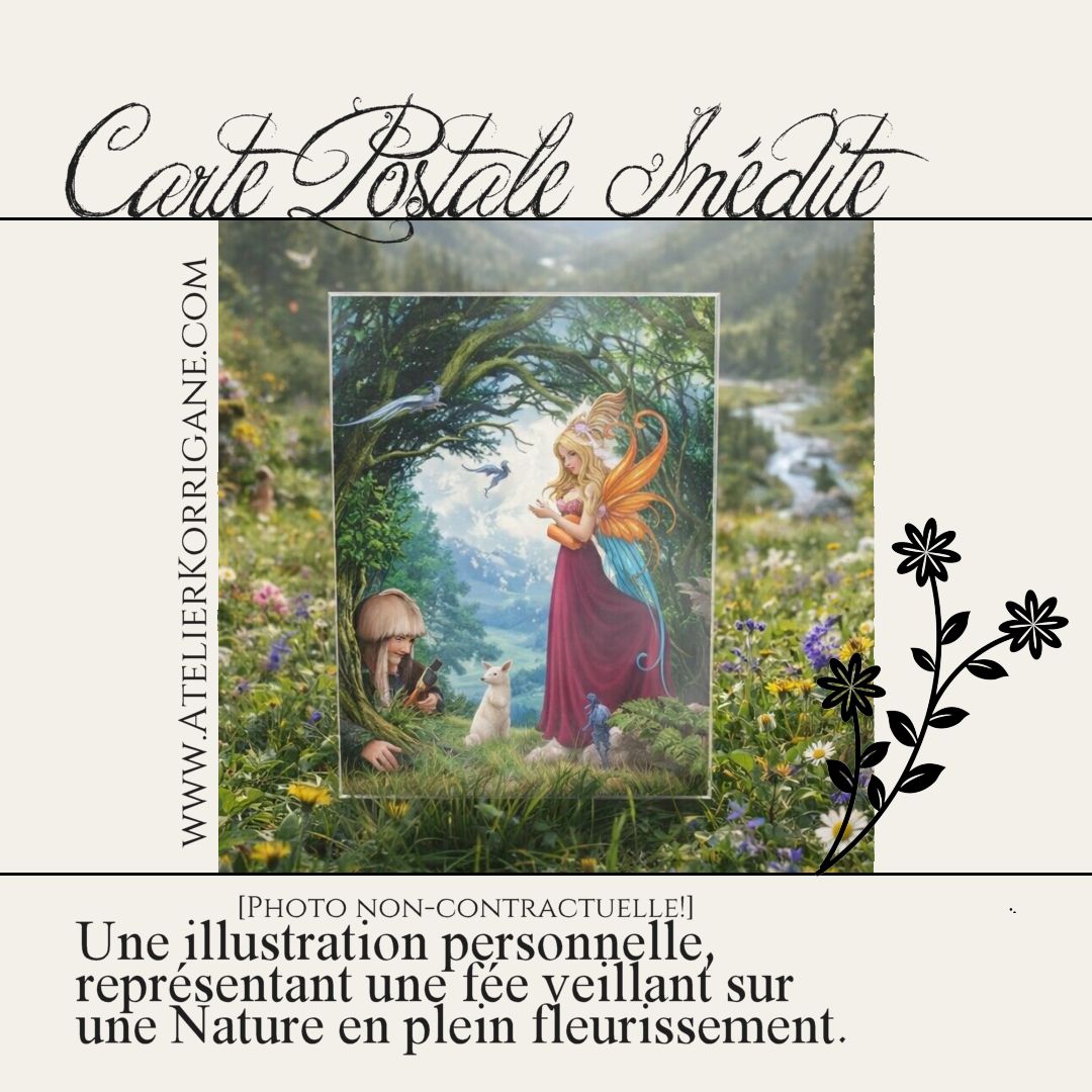 ・Une carte postale : une illustration personnelle, représentant une fée veillant sur une Nature en plein fleurissement ;