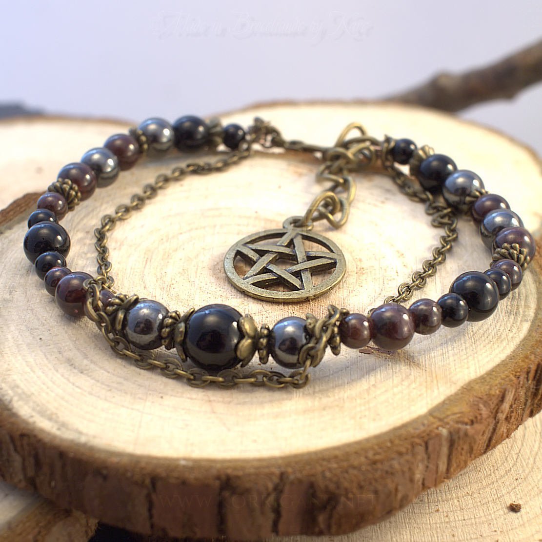 Bracelet Kendoniañ - Pentagramme Pentacle Wicca - Onyx, Grenat, Hématite - Artisanat - Lithothérapie