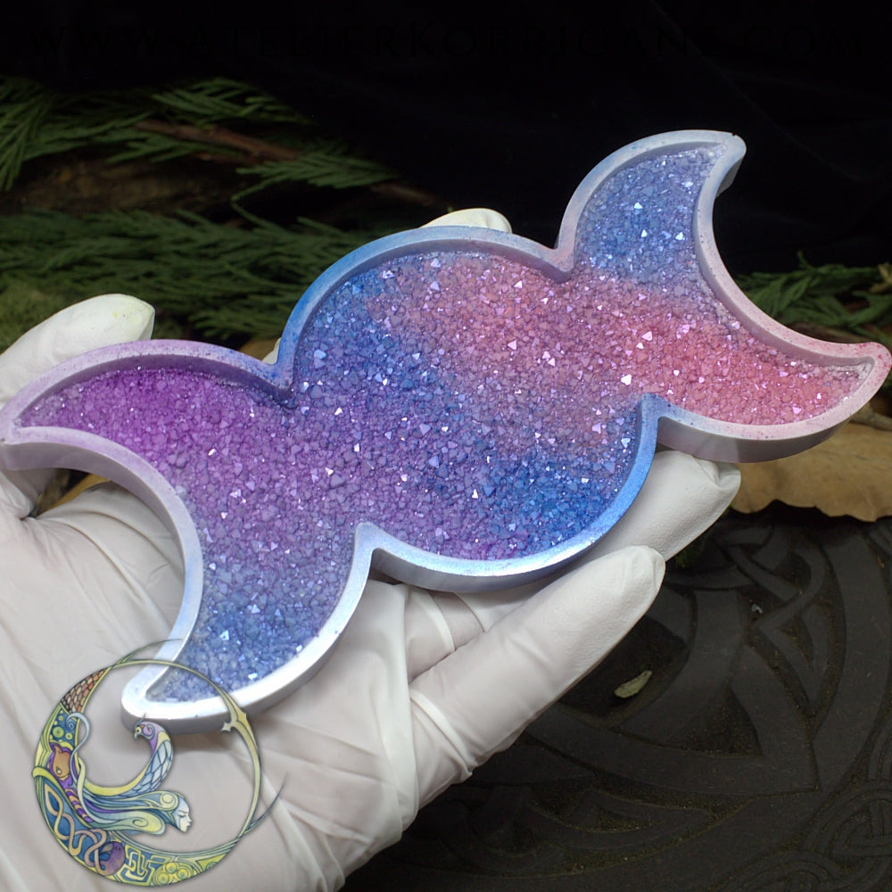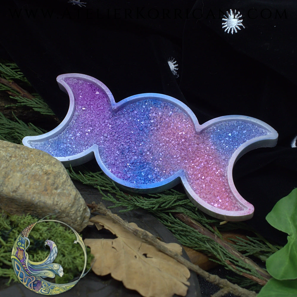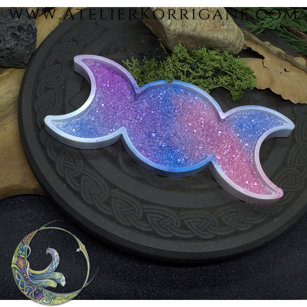 Cette Triple Lune est en forme de coupelle, elle sera parfaite pour vos autels et célébrations. Elle est incrusté d'un revêtement type "druze", le fond de la coupelle forme pleins de petits cristaux ce qui lui permet de briller de 1000 feux. Vous pouvez l'utiliser pour accueillir une bougie par exemple.
