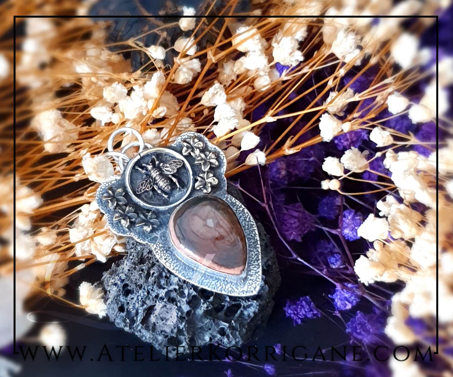 Pendentif Litha Abeilles en Bois Pétrifié et Argent Massif
